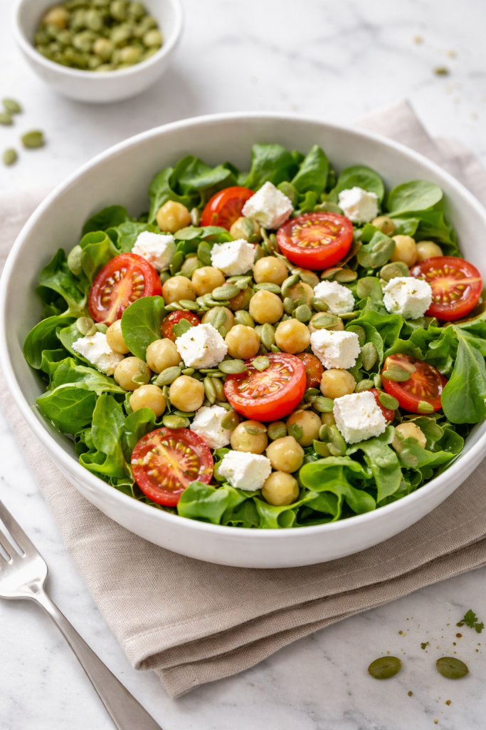 Wash the lamb’s lettuce and place it in a bowl. Add the chickpeas, halved cherry tomatoes, crumbled feta, and pumpkin seeds. Drizzle with olive oil and finish with pepper.