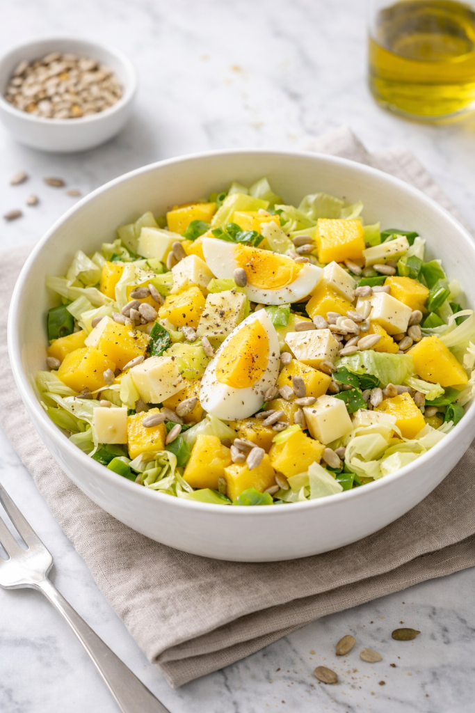 Boil the egg and slice it. Wash and chop the endive. Cut the mango into cubes and add pieces of young cheese. Sprinkle sunflower seeds on top. Finish with olive oil, pepper, and sea salt.