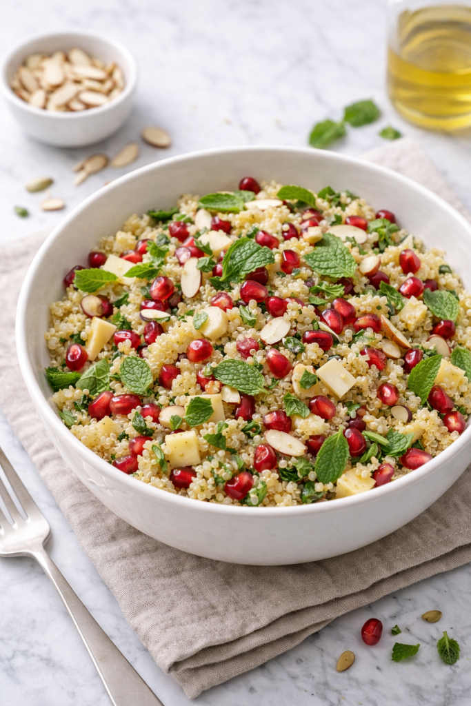 Place the cooked quinoa in a bowl. Add pomegranate seeds, chopped mint, and almonds. Mix olive oil with a little honey, cinnamon, pepper, and sea salt, then drizzle it over the salad.