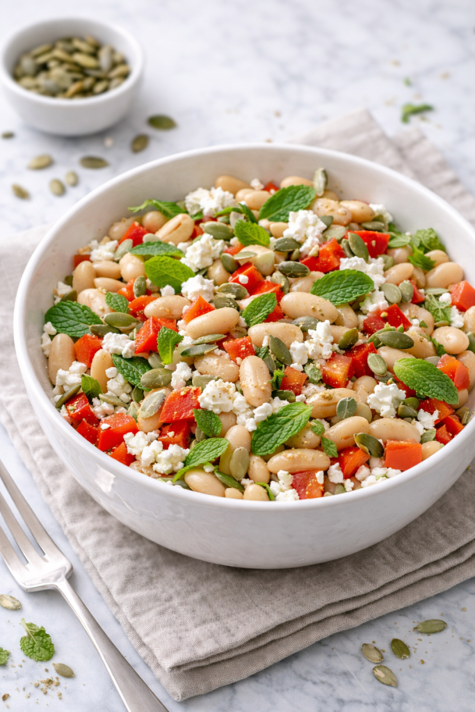 Rinse the beans and place them in a bowl. Add cottage cheese, chopped mint, sliced red bell pepper, and pumpkin seeds. Drizzle with olive oil and finish with pepper and sea salt.