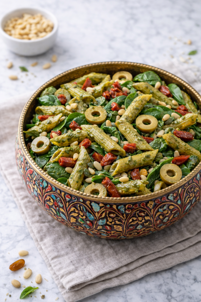 Cook the penne and let it cool slightly. Place spinach in a bowl and add the pasta, olives, sun dried tomatoes, and pine nuts. Mix pesto with a little olive oil and pepper and stir it through.