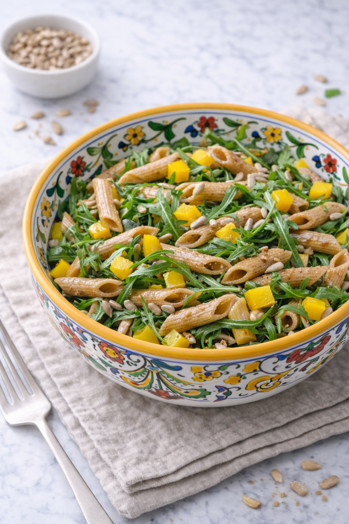 Cook the penne and let it cool slightly. Place arugula in a bowl and add pasta, sunflower seeds, and sliced yellow bell pepper. Drizzle with olive oil and finish with pepper and sea salt.