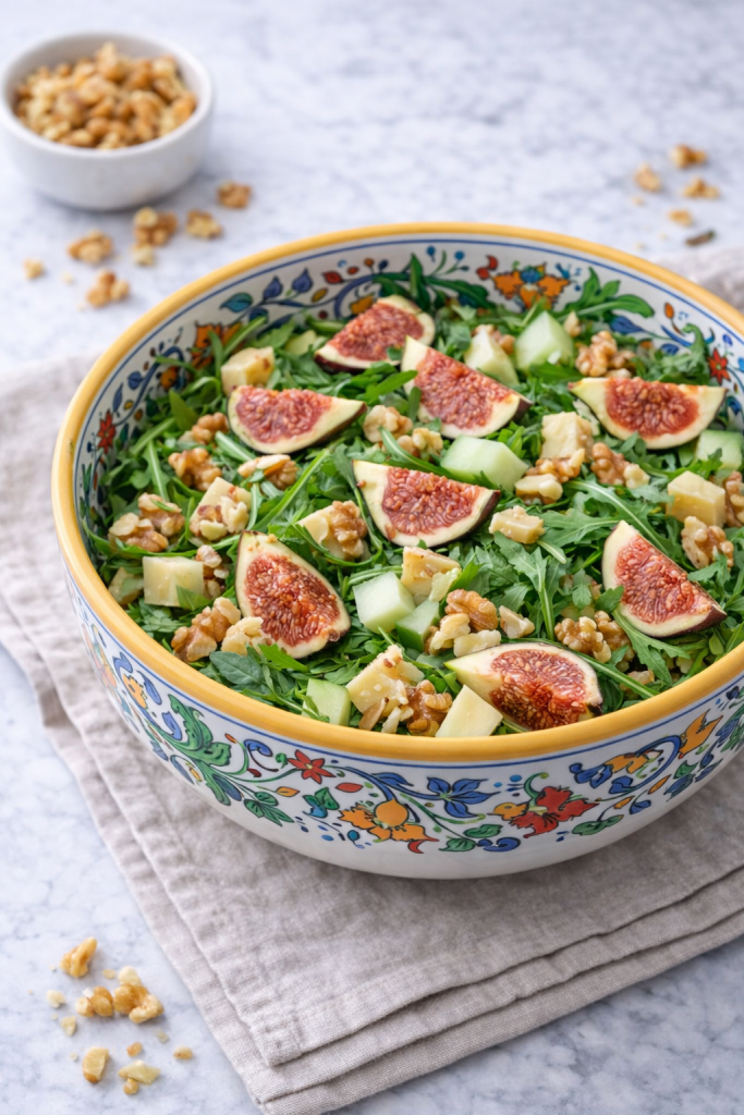Place arugula in a bowl. Slice the cucumber and quarter the figs. Add walnuts and pieces of aged cheese. Mix yoghurt with honey, mustard, dill, pepper, and sea salt, then drizzle it over the salad.