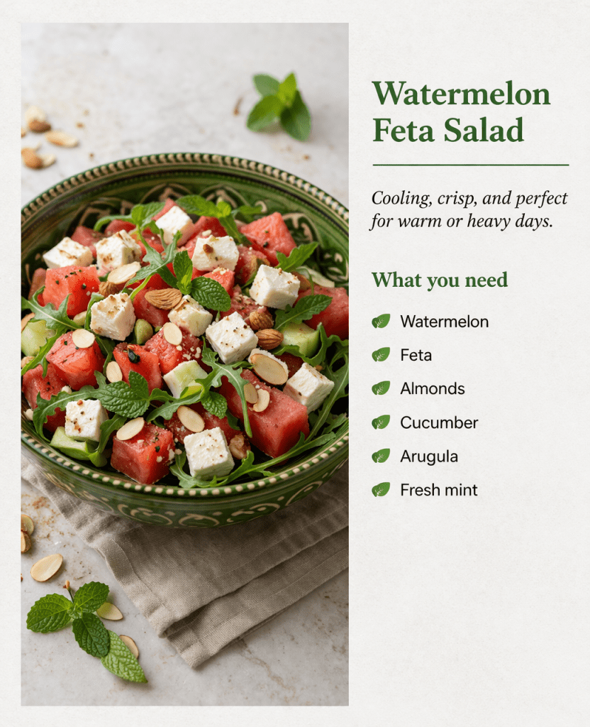 Cut the watermelon into cubes and slice the cucumber. Place arugula in a bowl and add watermelon, cucumber, feta, almonds, and mint. Drizzle with olive oil and lemon, then season with pepper and sea salt.